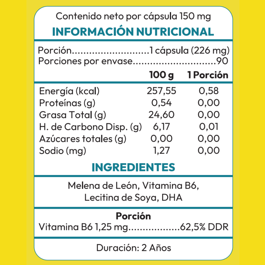 - Lecitina de Soya, fuente de colina, que apoya la comunicación neuronal y la memoria.